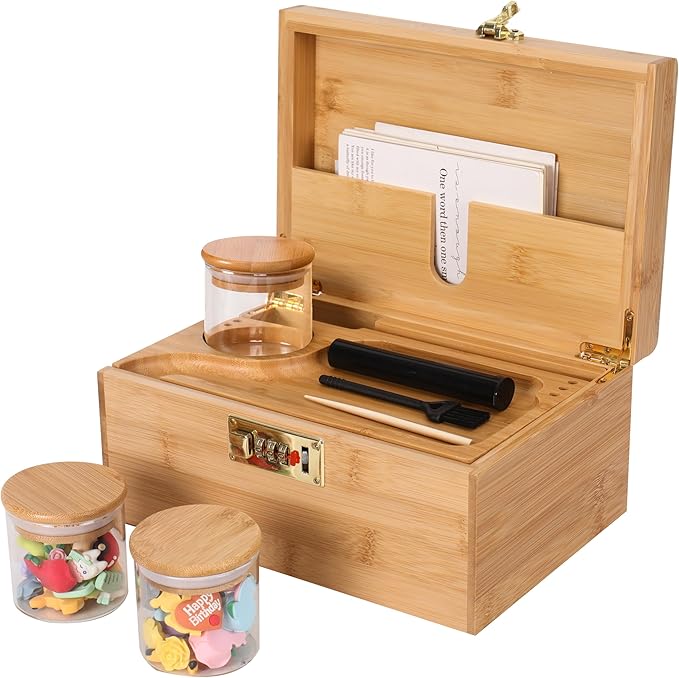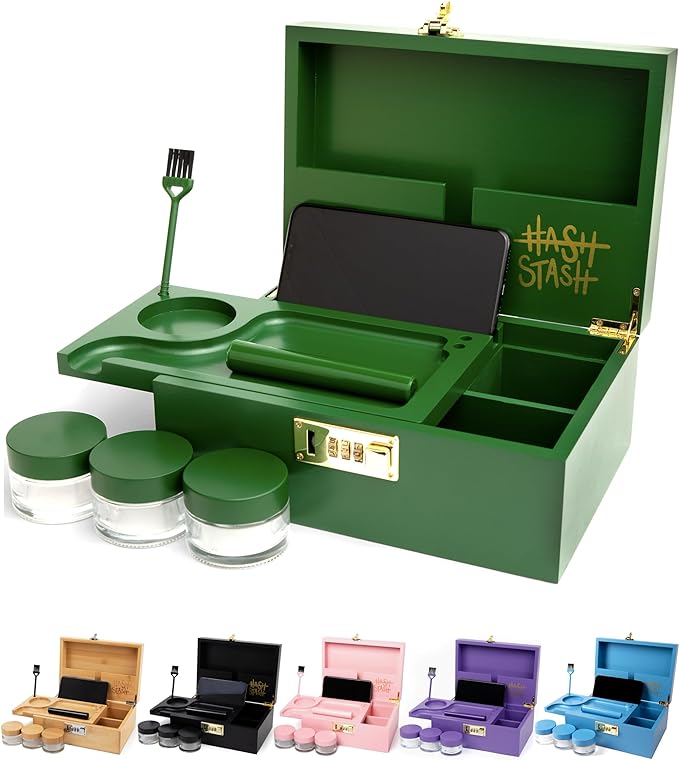 This versatile storage box features multiple compartments, ideal for organizing your cannabis accessories and stash and comes with a lock. We love the wood color but it does come in a variety of colors.