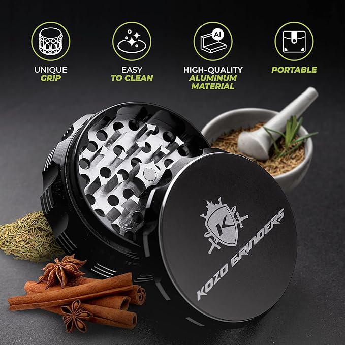This four-piece aluminum grinder from Kozo is a fan favorite, known for its precision and practicality. The sharp teeth ensure a smooth, even grind, while the built-in kief catcher adds an extra layer of utility for those who want to collect the finer particles of their herbs. The ergonomic design makes it easy to grip and turn, and the sleek black finish adds a premium feel. For its price and performance, this is a great all-around grinder that works well for both beginners and seasoned users.